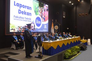 Acara selanjutnya diteruskan dengan Prof. Selo yang menyampaikan Laporan Dekan Fakultas Teknik pada tahun 2025. Dalam laporan tersebut, hadirin diajak untuk mengetahui kegitan dan pencapaian apa saja yang telah dicapai oleh Fakultas Teknik. Dalam kesempatan kali ini, Fakultas Teknik berhasil meluncurkan 3 buku yang berjudul Harmoni di Lorong Ilmu: Potret Keberlanjutan di Kampus Fakultas Teknik UGM, Cerita di Balik Dinding Hijau Kampus Teknik, dan Modul Pelatihan Pengelolaan Sampah.