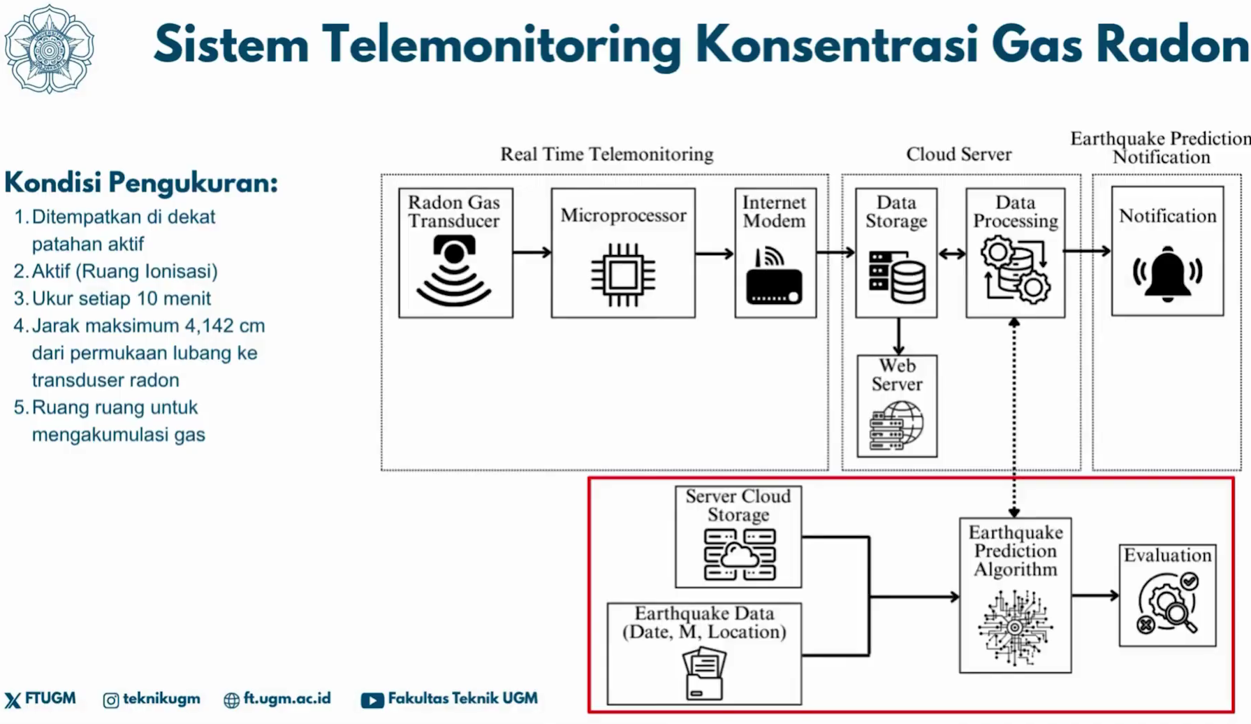 Fenomena tersebut kemudian Thomas dan tim manfaatkan sebagai indikator awal gempa. Sistem yang dikembangkan bekerja dengan memasang sensor atau transducer gas radon pada titik-titik tertentu, seperti sumur. Data konsentrasi radon yang terukur akan dikirim melalui mikroprosesor dan diunggah ke cloud server secara real-time. Selanjutnya, data tersebut diolah menggunakan model analisis untuk memprediksi potensi terjadinya gempa, termasuk estimasi waktu dan magnitudo.