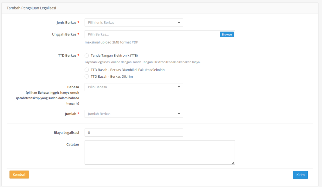 - Unggah dokumen yang akan dilegalisir, isi form, lakukan pembayaran dan konfirmasi pembayaran.
