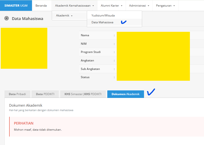 | Terdapat isian naratif tentang diri pribadi mahasiswa | Silakan kontak departemen, untuk verifikasi naratif dan proses berikutnya | |||