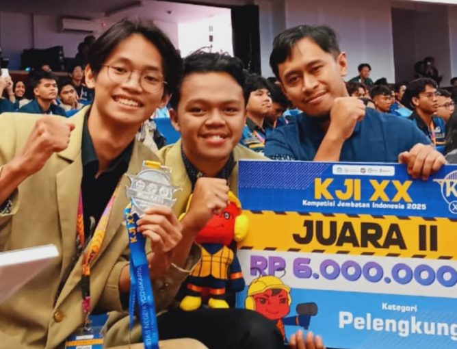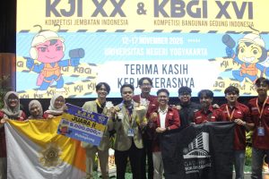 Kompetisi Jembatan Indonesia (KJI) yang telah berlangsung selama dua dekade akhirnya mencatat sejarah baru bagi UGM. Tim Perancang Brotoseno, beranggotakan Emmanuelle Levy Heryanto dan Rizki Haikal Pradana, berhasil meraih Juara 2 pada Kategori Jembatan Pelengkung—prestasi tertinggi UGM sepanjang penyelenggaraan KJI.