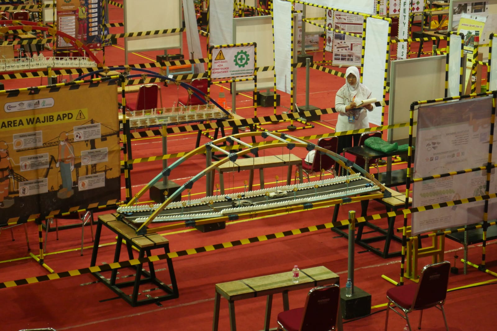 Panitia menetapkan batas lendutan maksimal sebesar 5 mm. Mengacu pada aturan tersebut, Tim Brotoseno menargetkan pembacaan lendutan awal tidak boleh melebihi 0,4 mm pada beban 20 kg. Hasilnya, jembatan mereka hanya mencatat lendutan awal 0,27 mm—jauh di bawah target. Angka ini menegaskan bahwa desain mereka berada di jalur yang tepat dan membuat ketegangan yang mereka rasakan perlahan mereda. Seiring pengujian berlanjut hingga beban 250kg, struktur Jembatan Prabajaya tetap kokoh dan tidak mengalami collapse.