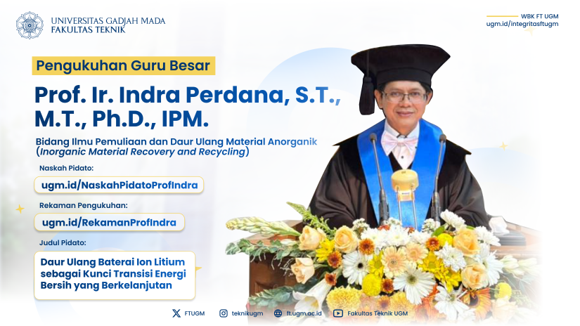 Dalam pengukuhannya, Prof. Indra juga memaparkan capaian riset daur ulang baterai oleh tim UGM. Teknologi yang dikembangkan telah mampu menghasilkan kemurnian dan sifat material yang memenuhi standar minimum sebagai bahan baku baterai ion litium. Salah satu terobosan penelitian tersebut adalah penerapan teknologi ultrasound, yang memungkinkan pengendalian ukuran partikel prekursor litium karbonat.