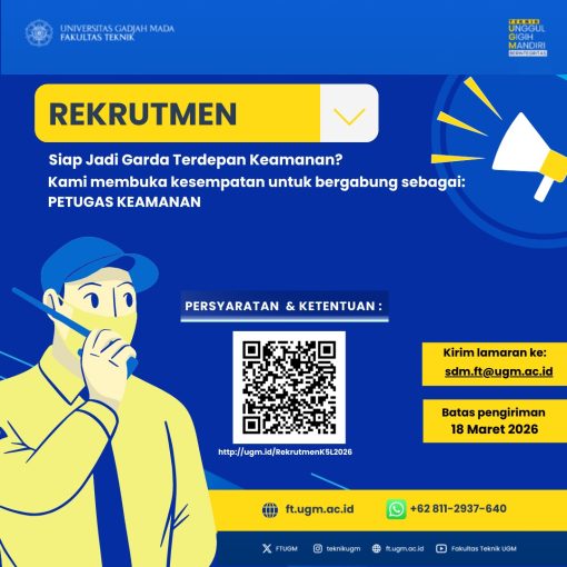 Fakultas Teknik Universitas Gadjah Mada membuka kesempatan bagi pribadi bersemangat tinggi untuk bergabung mendorong kemajuan dunia pendidikan, penelitian dan pengabdian masyarakat melalui pelayanan satuan pengamanan. Skema kepegawaian yang ditawarkan adalah pegawai kontrak sejumlah 5 orang tenaga keamanan dengan penempatan di Fakultas Teknik.